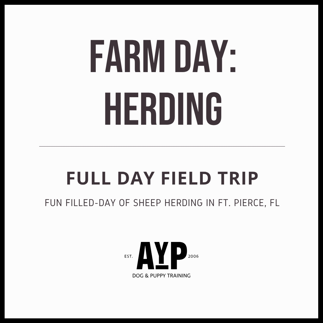 Have your dog join AYP’s Instructor Dee Hoult and Mike Horgan of Draxen Farms for a fun-filled day of sheep herding in Ft. Peirce, FL. The $150 fee includes sheep herding facility rental, instructor(s) fee, and transport costs. We’ll provide you with a video of your dog working sheep on the farm. Our K9 transport van will leave AYP at 7 AM from Miami on the day of the trip and pick up dogs at 7:30 AM from our Oakland Park location. Farm day ends around 3pm, so we anticipate being “home” around 6 PM the same day. We will let you know when our ETA arrival time to the facility is for pick up once we leave Draxen Farms. Let your dog do what it was bred to do!
